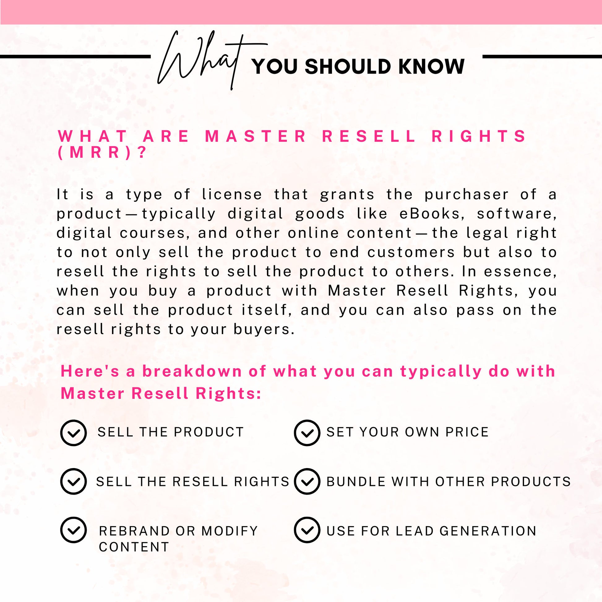 Here's a breakdown of what you can typically do with Master Resell Rights:
